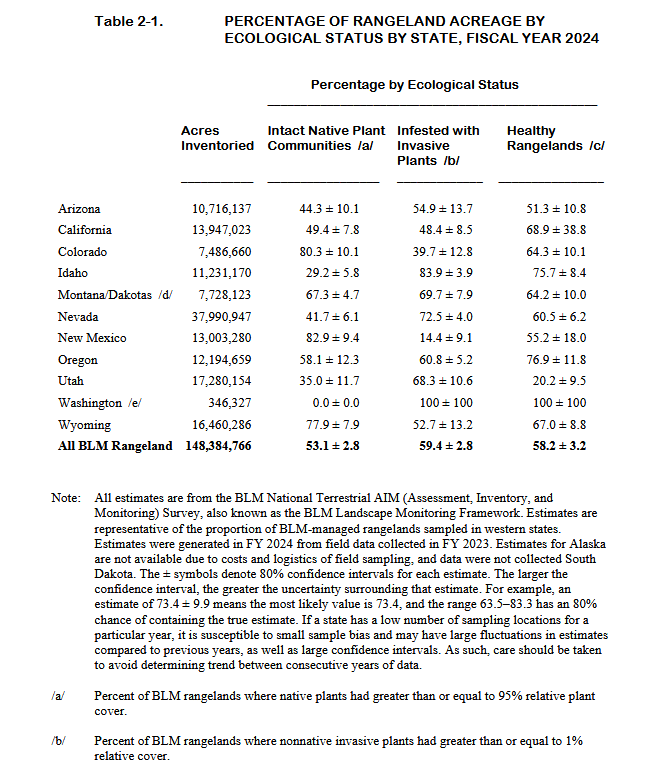 Recent AIM reports show troubling declines in land health. According to the most recent Public Lands Statistic report from June 2025, only 53% of BLM lands have intact native plant communities, while 59% of acres are affected by invasive plants.
