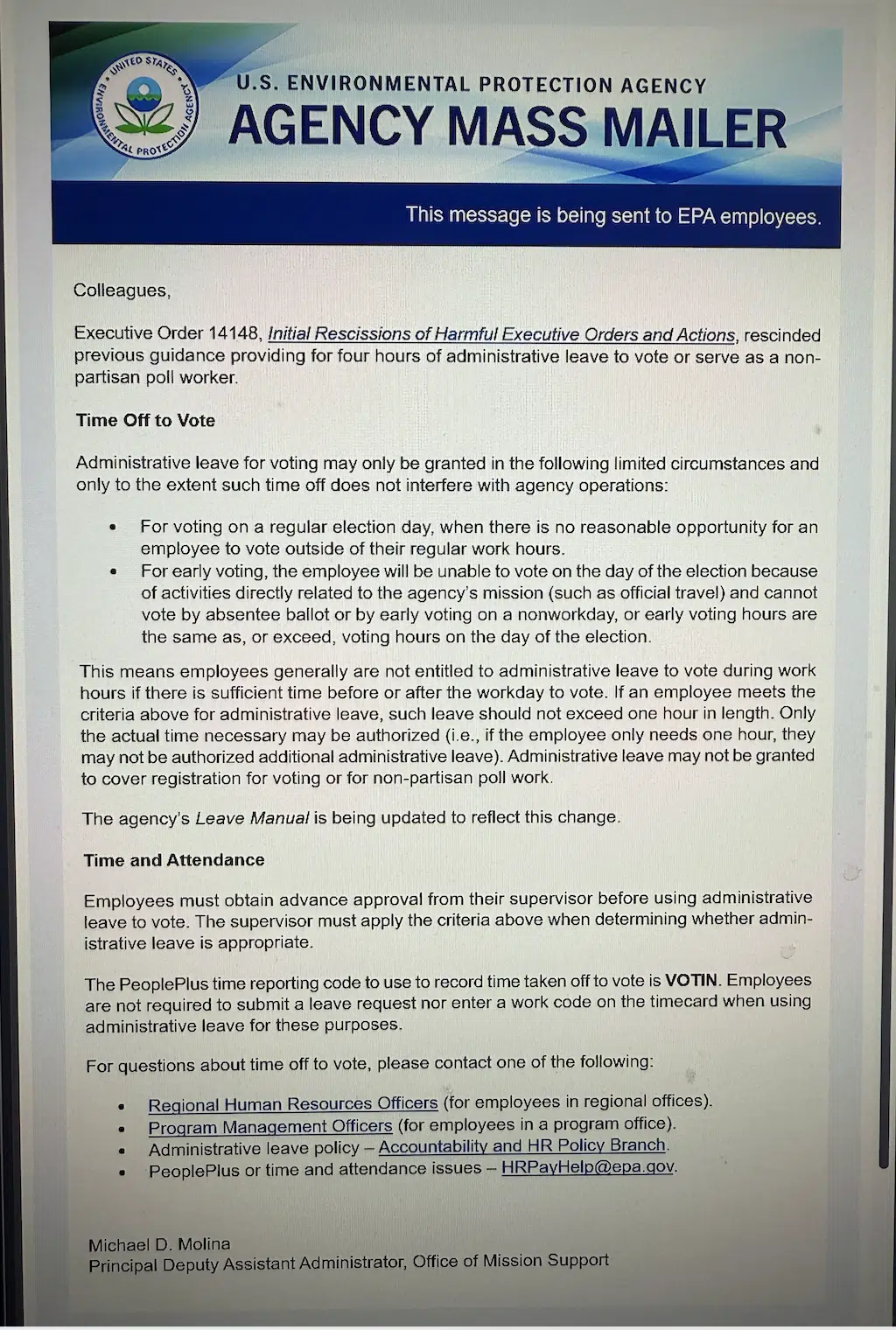 The prior policy was that all federal employees could take up to four hours of paid administrative leave to vote or serve as a volunteer nonpartisan poll-worker. This common practice was codified as an official government-wide policy under a 2021 Biden Executive Order. But on the first day of his second term, Trump issued an Executive Order rescinding a score of Biden-era orders, including that one.